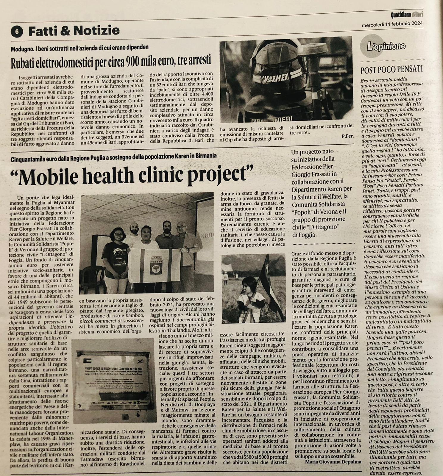 Nella situazione attuale, peggiorata sensibilmente dopo il colpo di stato del 1 febbraio 2021, il Dipartimento Karen per La Salute e il Welfare ha bisogno di incrementare l’acquisto e la distribuzione di farmaci nelle cliniche mobili. In ciascuna clinica mobile sono presenti sette operatori sanitari addetti alla medicina di base e al pronto soccorso, per una popolazione che va dai 3500 ai 5000 profughi interni.